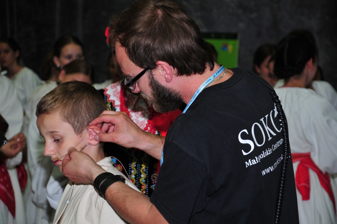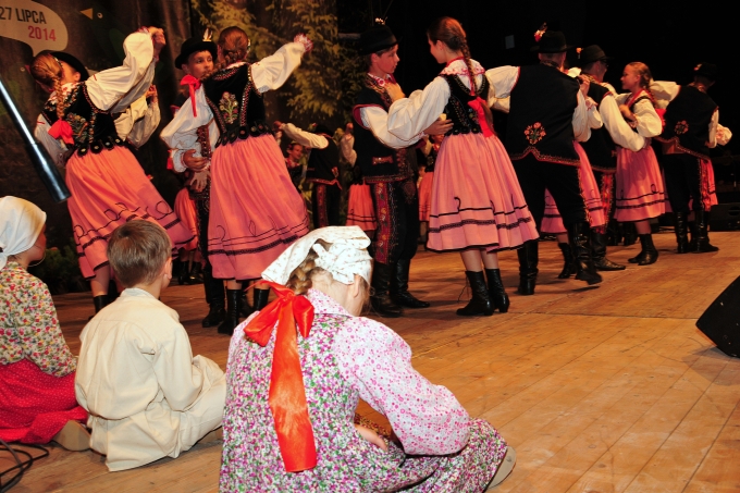 Nie ma muzyki, może być zabawa… berek na przykład, ale to chwilkę tylko. Już idą dźwięki, a za dźwiękami piękna Laszka ze skrzypcami. I już wiadomo, że kończy się majówka. Trza zatańczyć, co kto umie, np. poleczkę. I jakoś tak jest chyba, że wielką moc ma dźwięk skrzypiec, bo przyciągnął całą lachowską muzykę z charakterystycznym klarnetem, trąbką, a i strun się jakby namnożyło. Mali tancerze, ubrani jak należy, czyli w len i jadwisie, wywołują kolejne tańce. Polka, Sztajerek, Kukułeczka (która wszystkim znającym Festiwal przypomina, że za każdą minutą zbliżamy się do defilady podczas koncertu finałowego)… Tkaczyk.