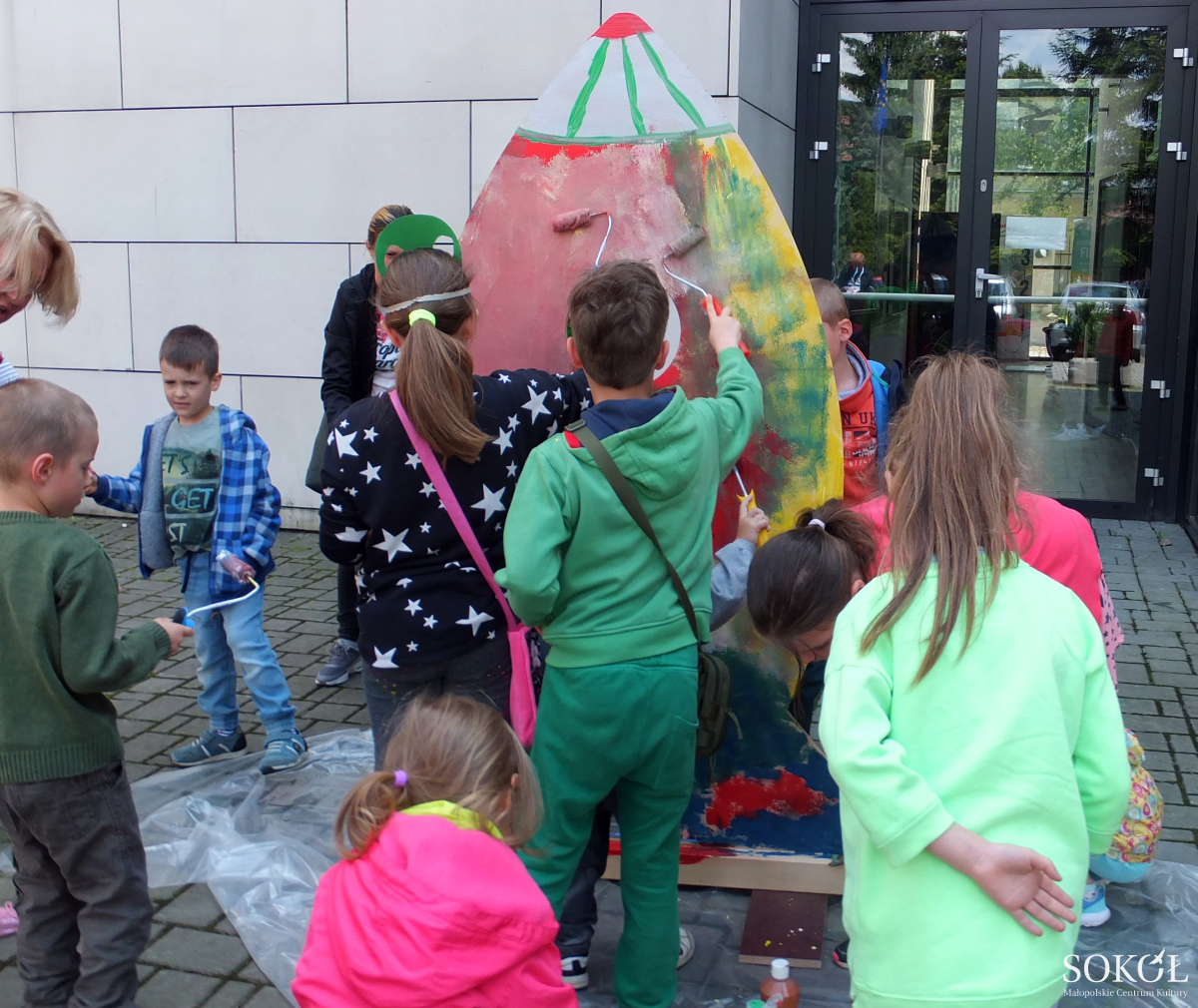 Po seansie młodzi uczestnicy zajęć, z pomocą rodziców, na dziedzińcu SOKOŁA niezwykle serio zajęli się malowaniem modelu rakiety. Dziecięcy design zdobył uznanie widzów. Również otrzymane upominki wywołały uśmiech na ustach obdarowanych. Słowem, było wesoło, naukowo i relaksacyjnie.