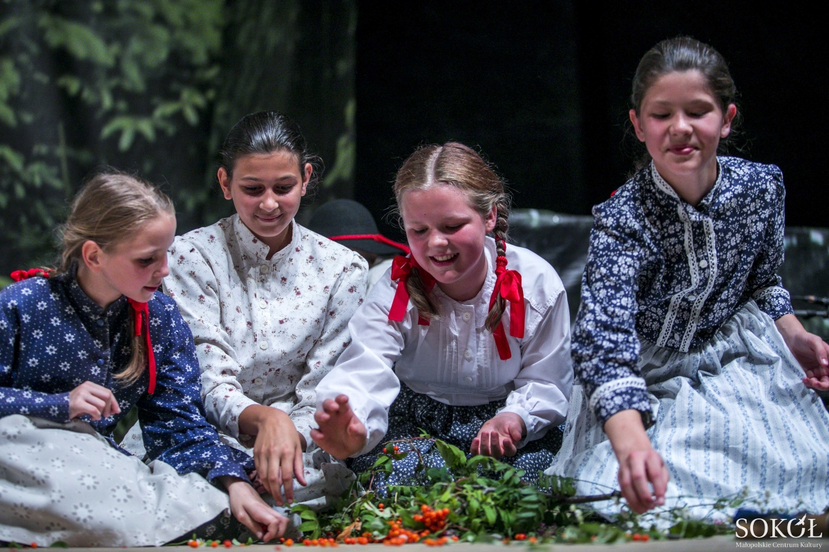 Wchodzi dudziarz i skrzypaczka, dziewczyny przyśpiewują i wirują, wirują i przyśpiewują… I w ten śpiew… trzask bata, jeden, drugi, kolejne. Znów spoza sceny, daleko z kulis. A bat, kiedy strzela, może krowy wystraszyć, ale może też nie strzelać, tylko krążyć pod nogami, a potem pod rękami. I za skakankę bat może służyć, i dwie zakrzywione laski też mogą być jak skakanka. Wszystko może być zabawką.