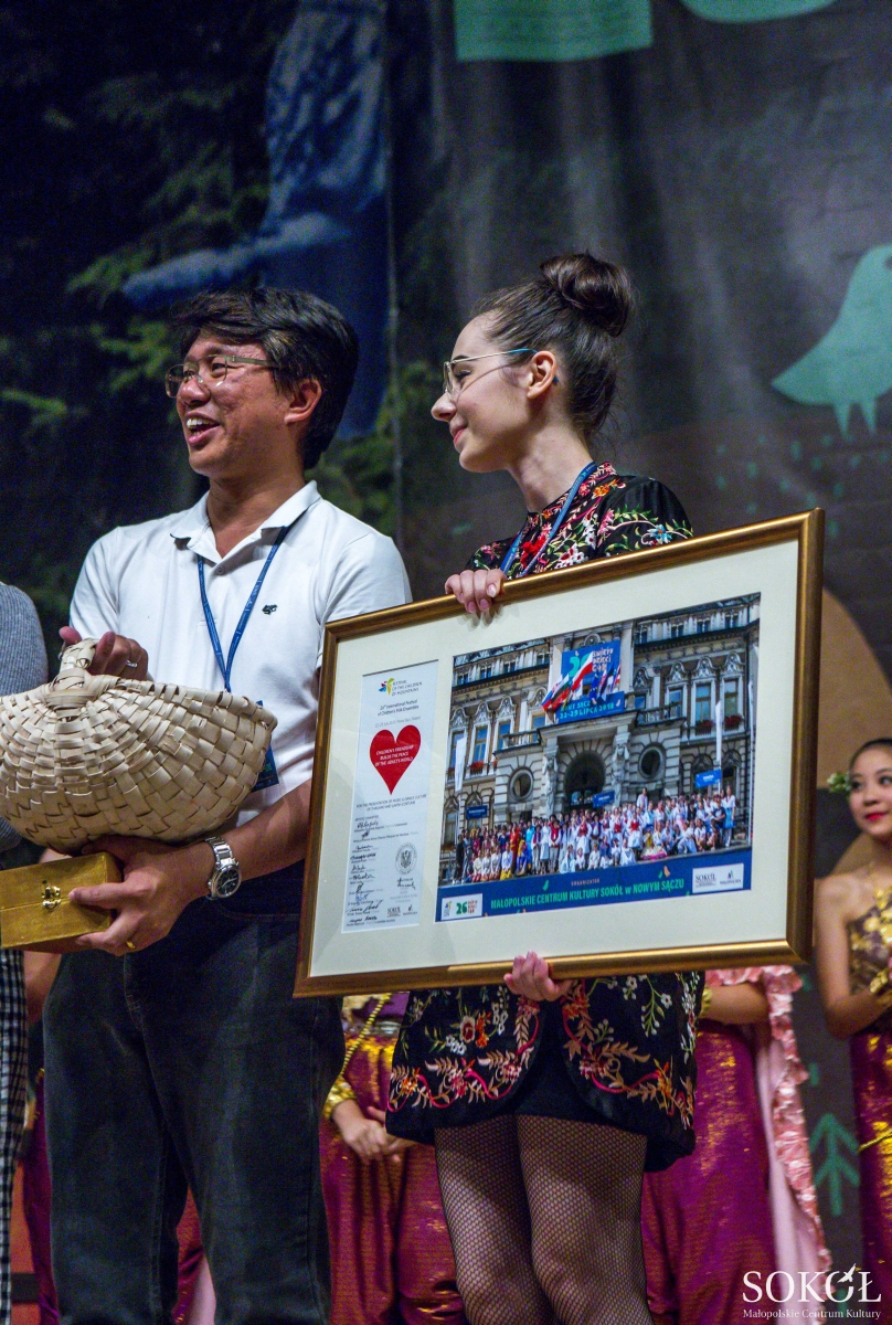 Na chwilę wracamy do Tajlandii. Taniec jałmużników, na tle ksylofonu – delikatne dzwoneczki w rękach delikatnych dziewcząt. Jeden z uprzednich wojowników wchodzi z bębnem, na jego okrzyk pojawia się kolejnych 8 bębniarzy. I kilku innych perkusjonistów. Czas na taniec i śpiew wszystkich dziewcząt. Ostatni akord, i niestety pożegnanie zespołu z Tajlandii z Festiwalem. Nie zobaczymy ich na koncercie finałowym. Dziś zatem jest czas, by otrzymali festiwalowego barana, pamiątkowe zdjęcie za kamrackimi zespołami i kosz słodyczy.